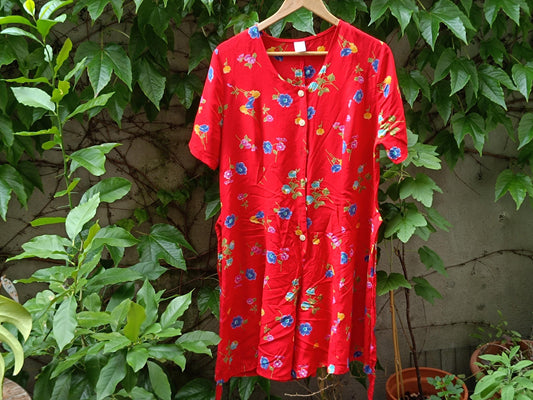80s Vintage Red Floral Playsuit – Short Sleeve Romper with Button Front, Retro Festival Outfit, Summer One Piece