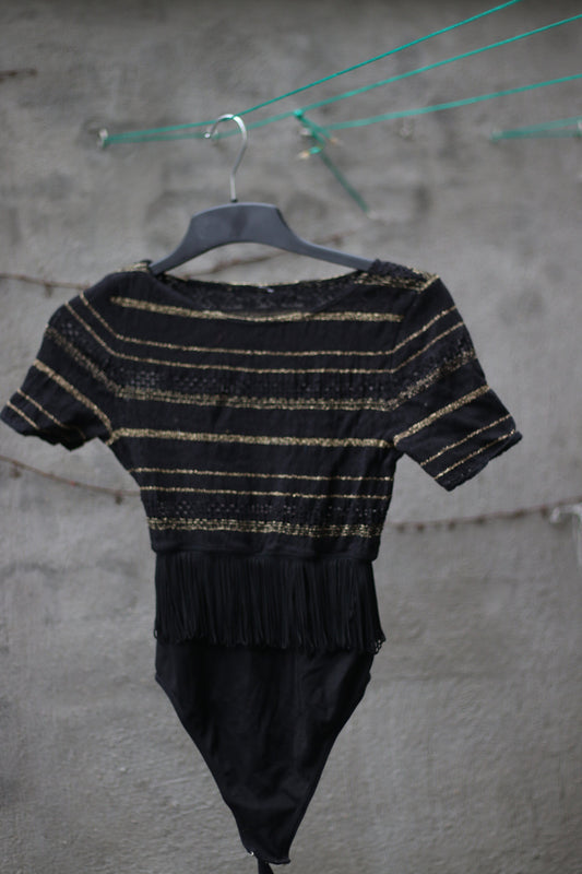 y2k black and gold bodysuit| Vintage one piece with tazzled details