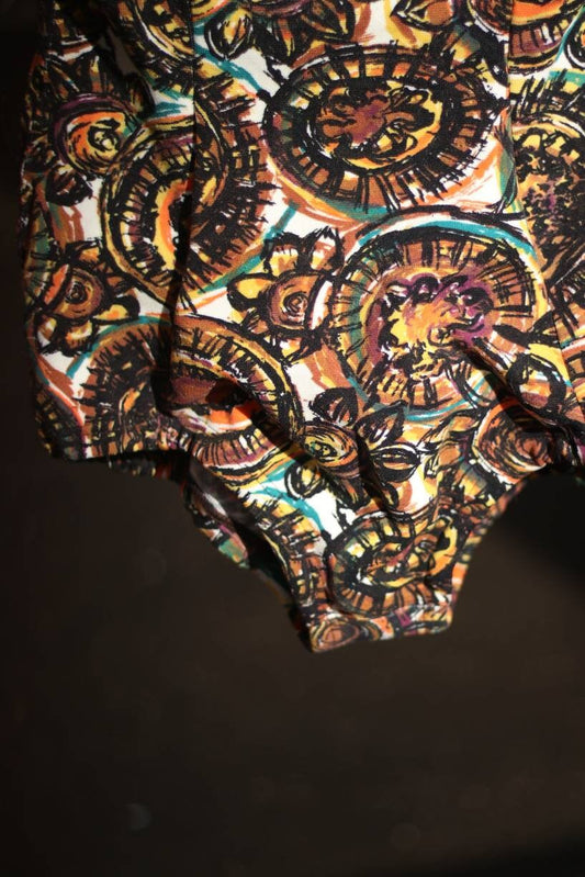Vintage Bodysuit with bold statement print | 70s handmade brown floral print one piece