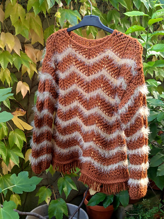 90s Fuzzy Chevron Sweater| Vintage Brown Boho Winter Knit| Long sleeved