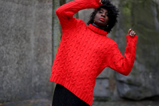 90s Red Turtleneck| Vintage Colorful Women's Knitwear| Vintage long-Sleeved Cable Knit Winter Jumper
