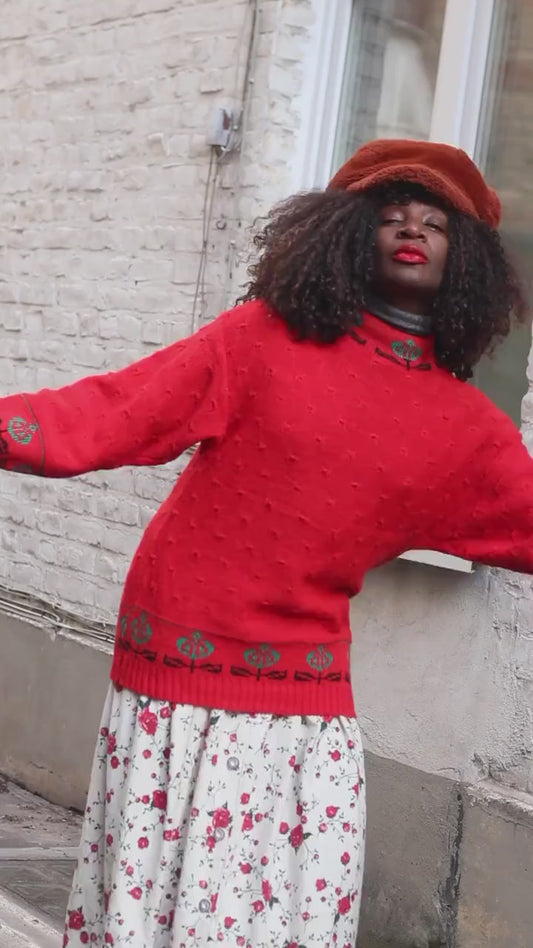 Vintage Red Knit Sweater | 90s Floral Border Oversized Retro Pullover