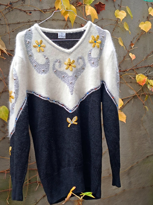 Vintage 80s Black & White Floral Embroidered Sweater, Sequin Detail V-Neck, Glam Cottagecore Statement Knit