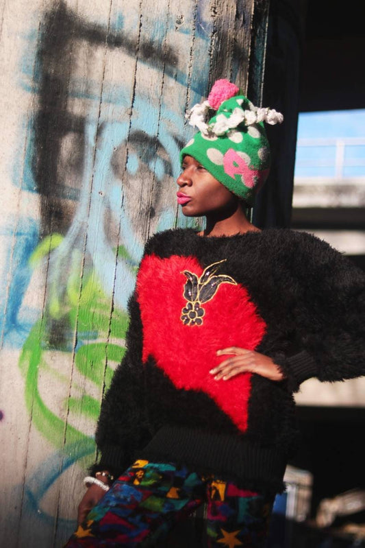 80s Red and black Fuzzy Sweater| Vintage crazy print jumper| Ugly Christmas Jumper| Maximalist winter knit with statement motif size small