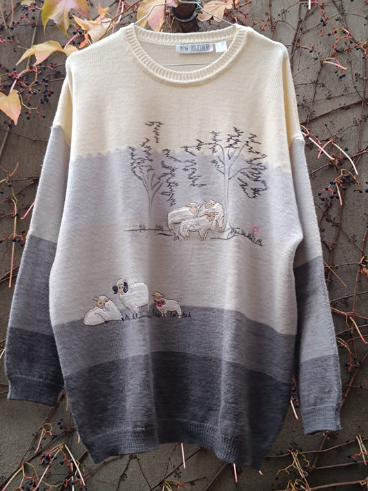 90s Novelty Sweater| Vintage Women's Wool Blend Sweater| Crazy Sheep Print Crewneck| Quaint Cottage Core Grey and Brown long sleeved Knit |