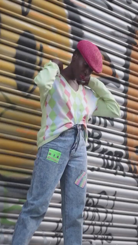 90s Grey Sweater| Vintage V neck Sweater with Abstract print| Maximalist Cozy long sleeve winter jumper