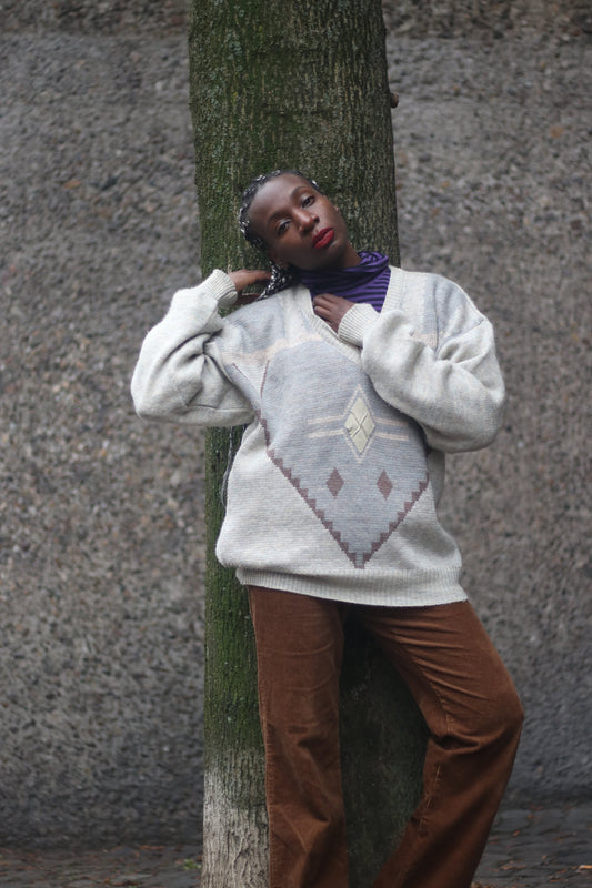 Vintage Wool Blend Sweater| 90s unisex knit in grey with statement geometric details