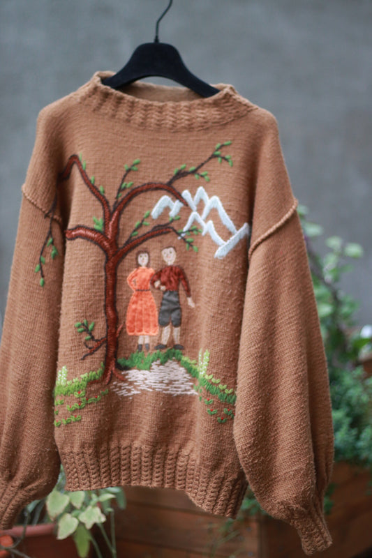 Vintage Handmade Sweater| 70s knit with embroidered details | Quirky winter jumper in brown