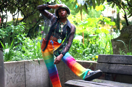 70s Psychedelic Pants| Women's Knitted Summer Trousers| Hippy Rainbow Colorful Boho Crocheted Bottoms