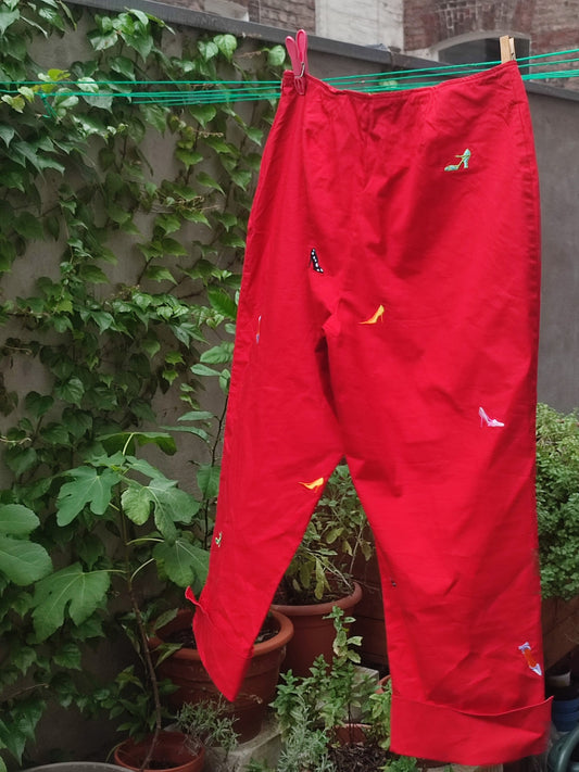 y2k red trousers| Vintage red pants with statement stilettos print| Quirky Summer pants