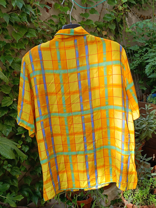 80s plaid blouse| Vintage yellow and green checkered shirt| Maximalist short sleeved unisex summer shirt