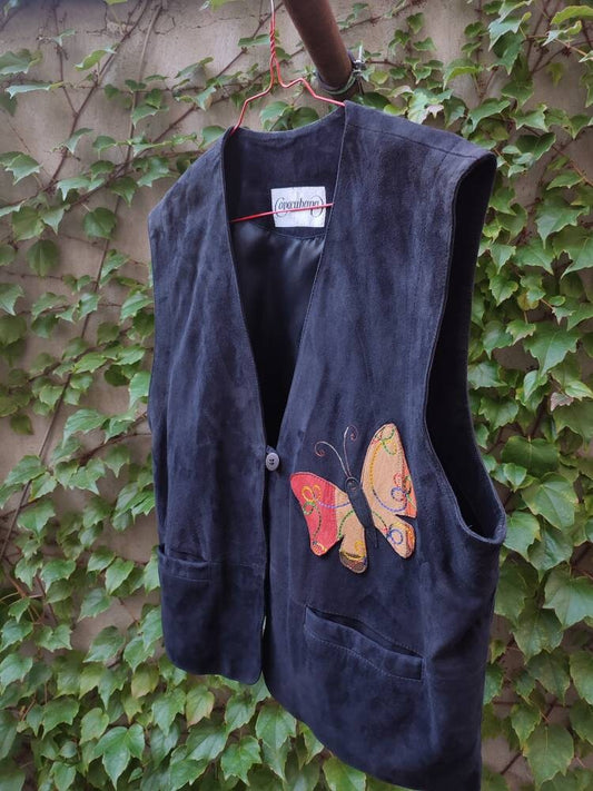 70s Copacabana Black Vest in Leather | Vintage Suede Vest with Butterfly motif| Western unisex vest| Women's leather vest